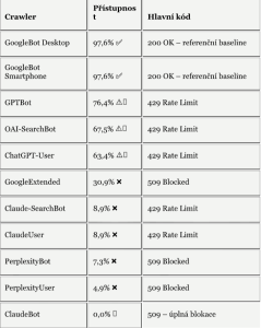 – analýzu přístupu konkrétních crawlerů (GPTBot, ClaudeBot, PerplexityBot, Google‑Extended apod.),